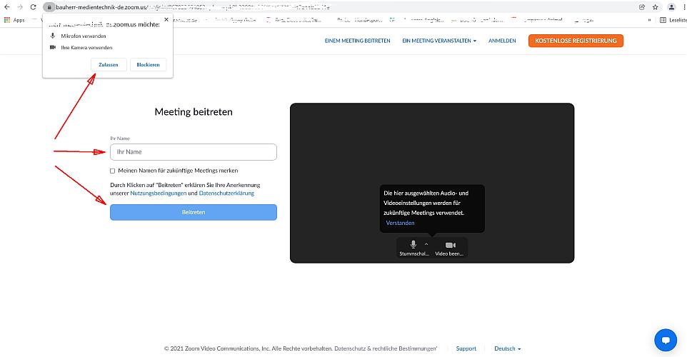Im nächsten Fenster klicken Sie als erstes oben auf Zulassen. Damit gestatten sie Zoom die Nutzung Ihres Mikrofons und Ihrer Kamera (das Schaltfläche kann, je nach Betriebssystem und Browser, etwas unterschiedlich aussehen).