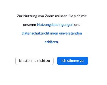 Stimmen Sie dann noch den Nutzungsbedingungen und Datenschutzrichtlinien von Zoom zu und Sie kommen direkt in das Meeting.